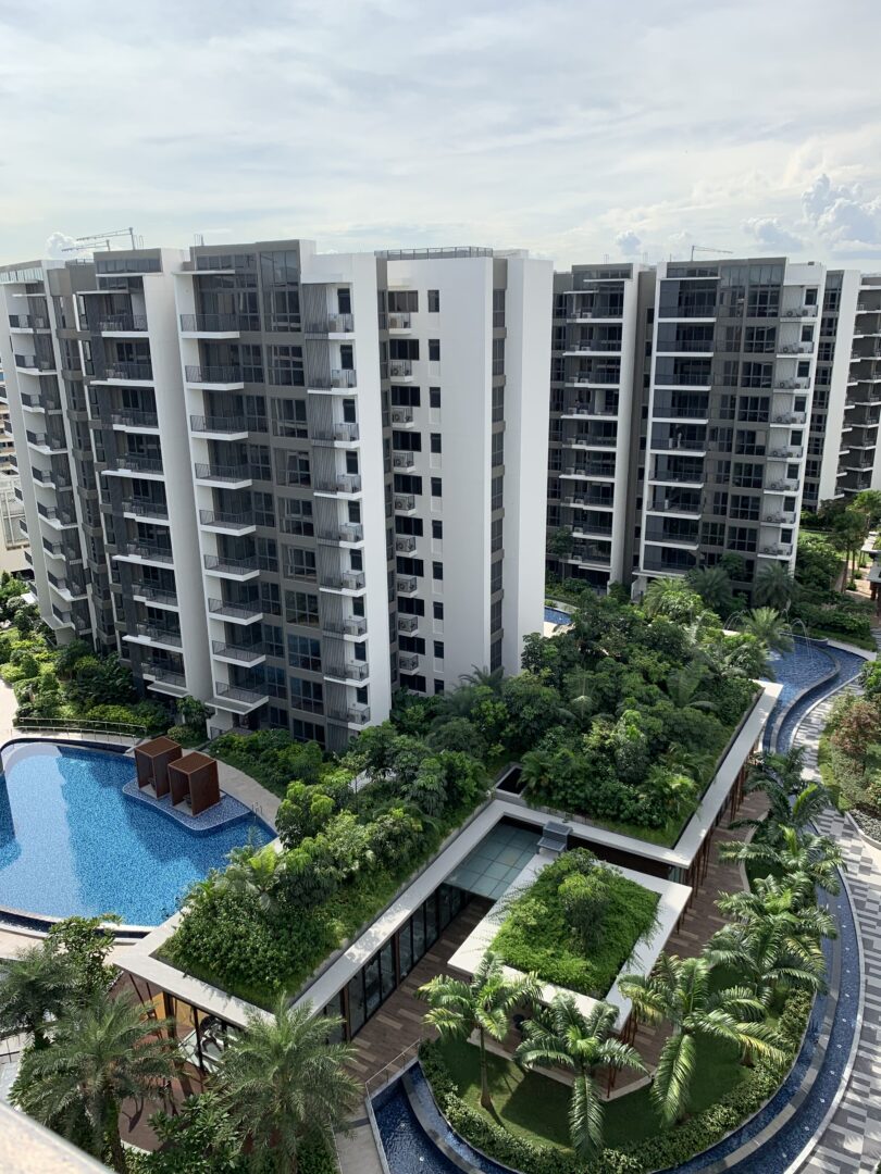 An architectural language of clean modern lines with generous overhangs is adopted to express the efficiency and elegance of modern living. Overhangs, characteristic of tropical living, offers protection from both strong direct sunlight and rain. Resultant sleek outlines are accentuated by shadows, adding to strong identifiable profiles. Double volume proportions are celebrated, offering a good expanse of glass facade and maximizing views, diffused daylight and natural ventilation for the units. This is further emphasized by double volume sky terraces, which are well-ventilated places of community gathering for residents. The vertical fins at the sky terraces create a distinctive architecture along Yishun Ave 2, while serving a dual function of screening from the MRT tracks. Collectively with the lushly landscaped facade of the podium, these elevated terraces form a strong design impression, creating an outstanding development along the main road Yishun Avenue 2.